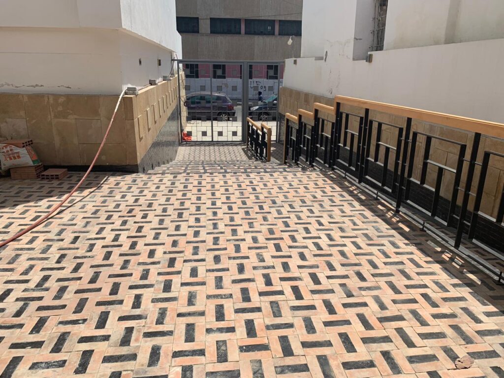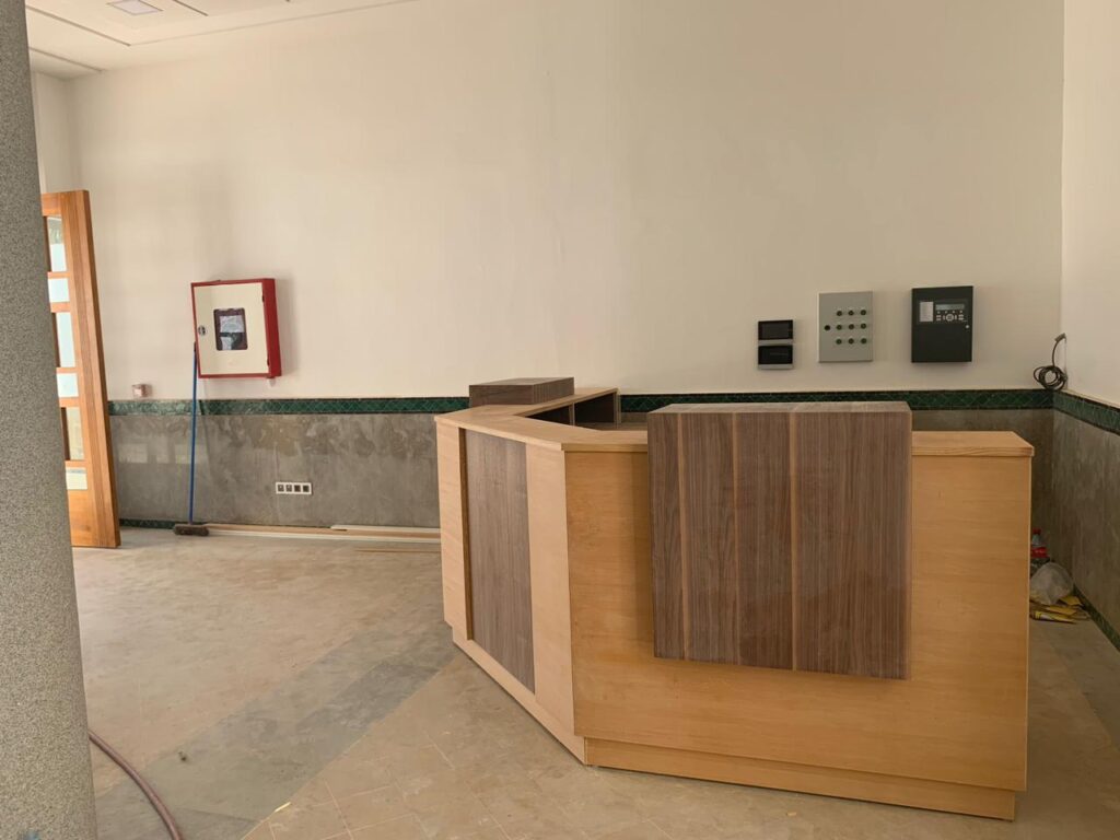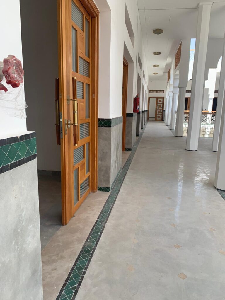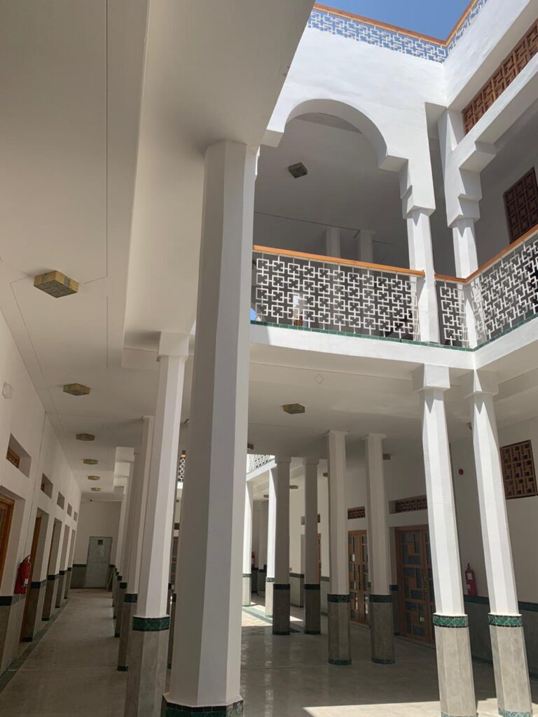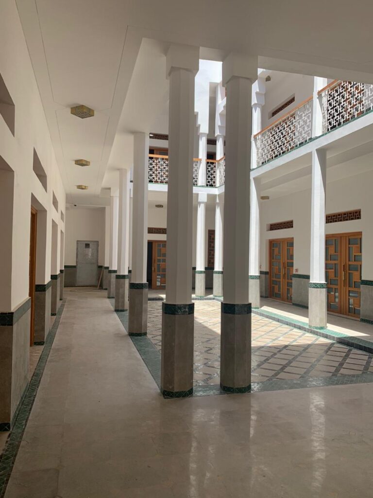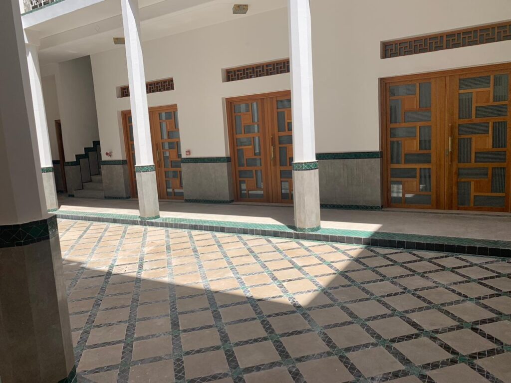 La reconversion de la Kissaria Al Fadl en pépinière d’entreprises représentait un défi majeur : préserver la typologie patrimoniale tout en offrant une architecture contemporaine. Il fallait conjuguer authenticité et modernité, respecter les matériaux traditionnels (zellige vert, pierre de Salé, bois de cèdre) et créer des espaces fonctionnels et lumineux sans tomber dans la copie artificielle.